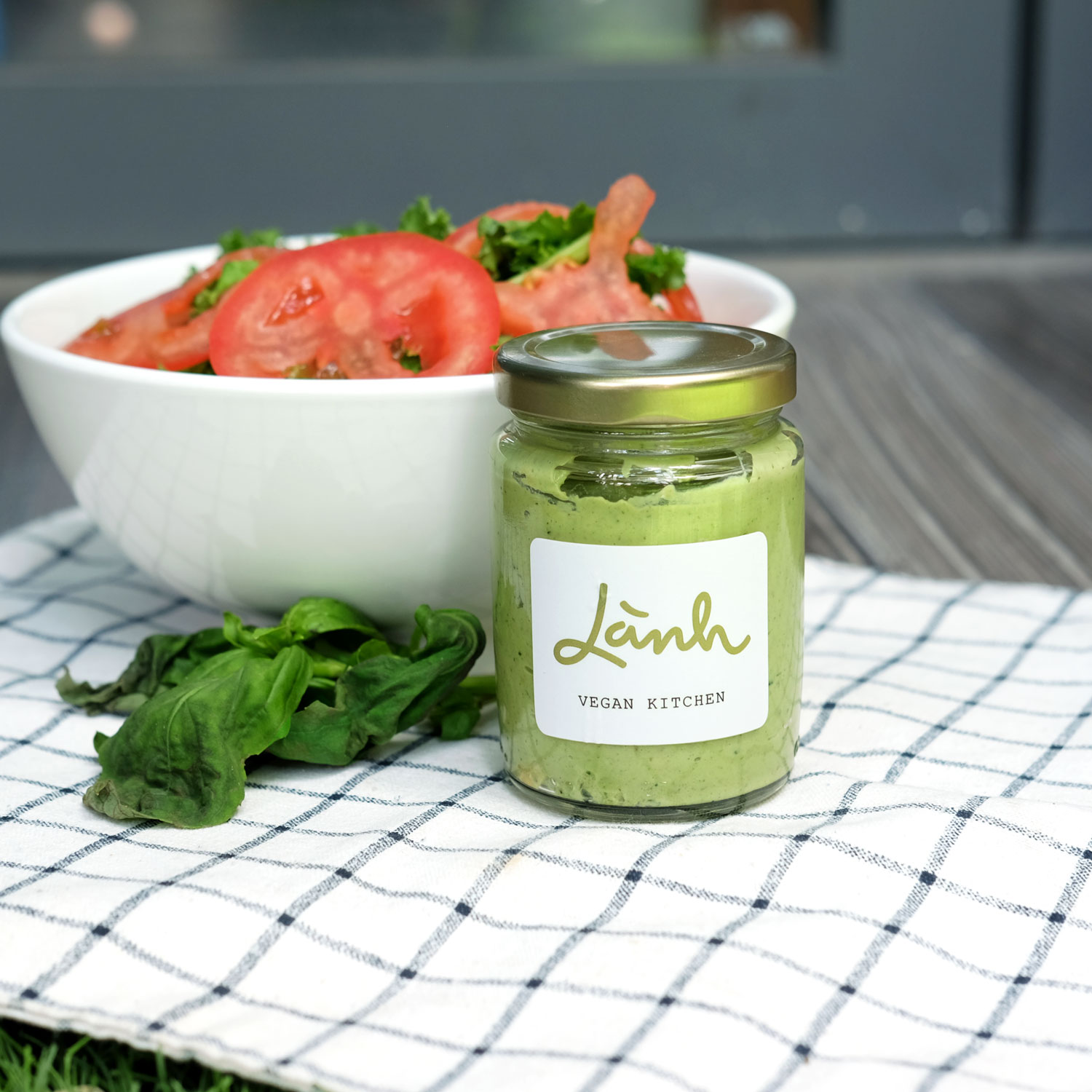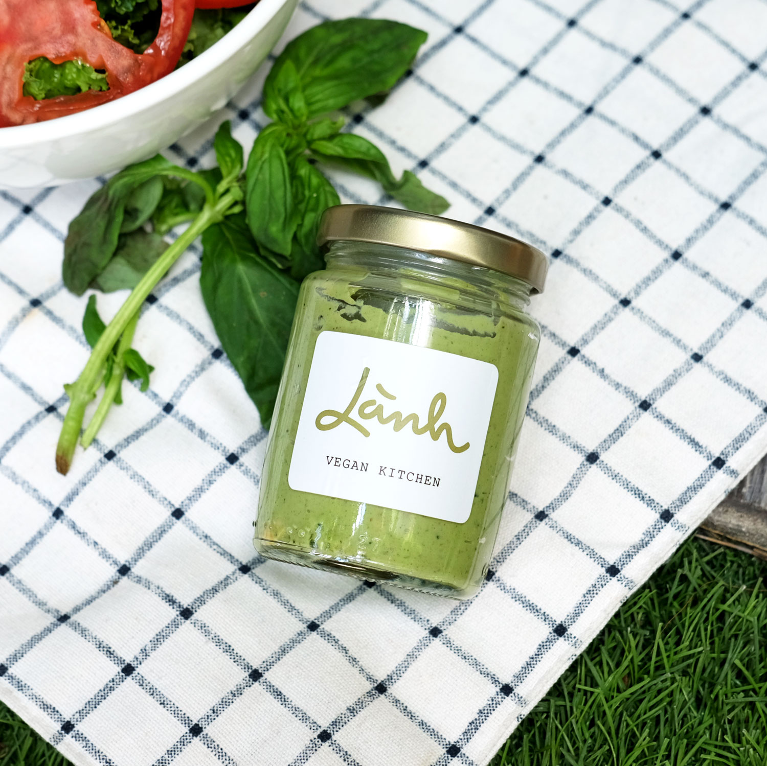 Lá húng quế tây tươi, hạt điều tươi, men nấm dinh dưỡng, dầu olive, muối, tiêu, tỏi tươi. Tại Bếp Lành, Vegan Cashew Pesto sử dụng hạt điều thay thế cho hạt thông châu Âu (thành phần của pesto truyền thống) tạo hương vị thuần Việt nhưng vẫn giữ được vị béo thơm đặc trưng của pesto.